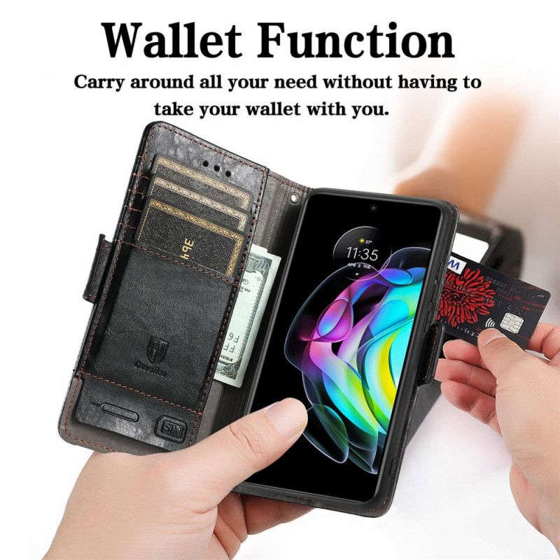 Det Tofargede Etuiet I Imitert Skinn Til Motorola Edge 20 Kommer Med Beskyttelse, Kortspor Og En Dobbel Lås.