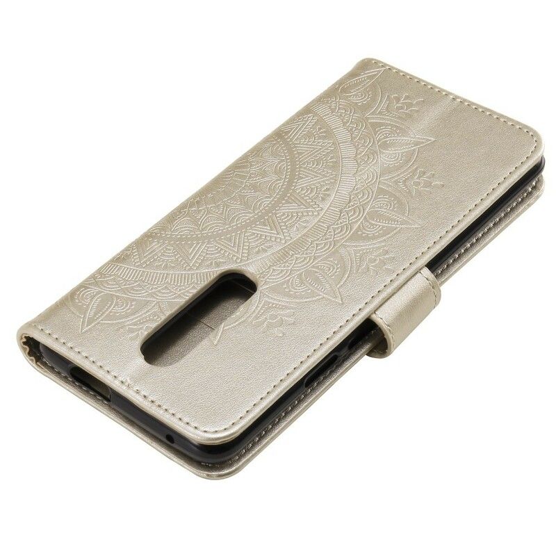Et Praktfullt Deksel Til Oneplus 7 Pro Med Mandala-Design Av En Sun Som Også Fungerer Som Lommebok Og Stativ.