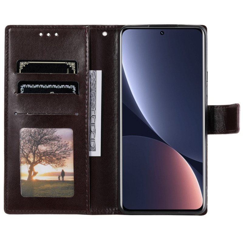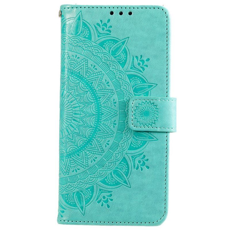 Et Deksel I Kunstskinn Dekorert Med En Solmandala Som Beskytter Xiaomi 12 Pro Og Fungerer Som En Lommebok.